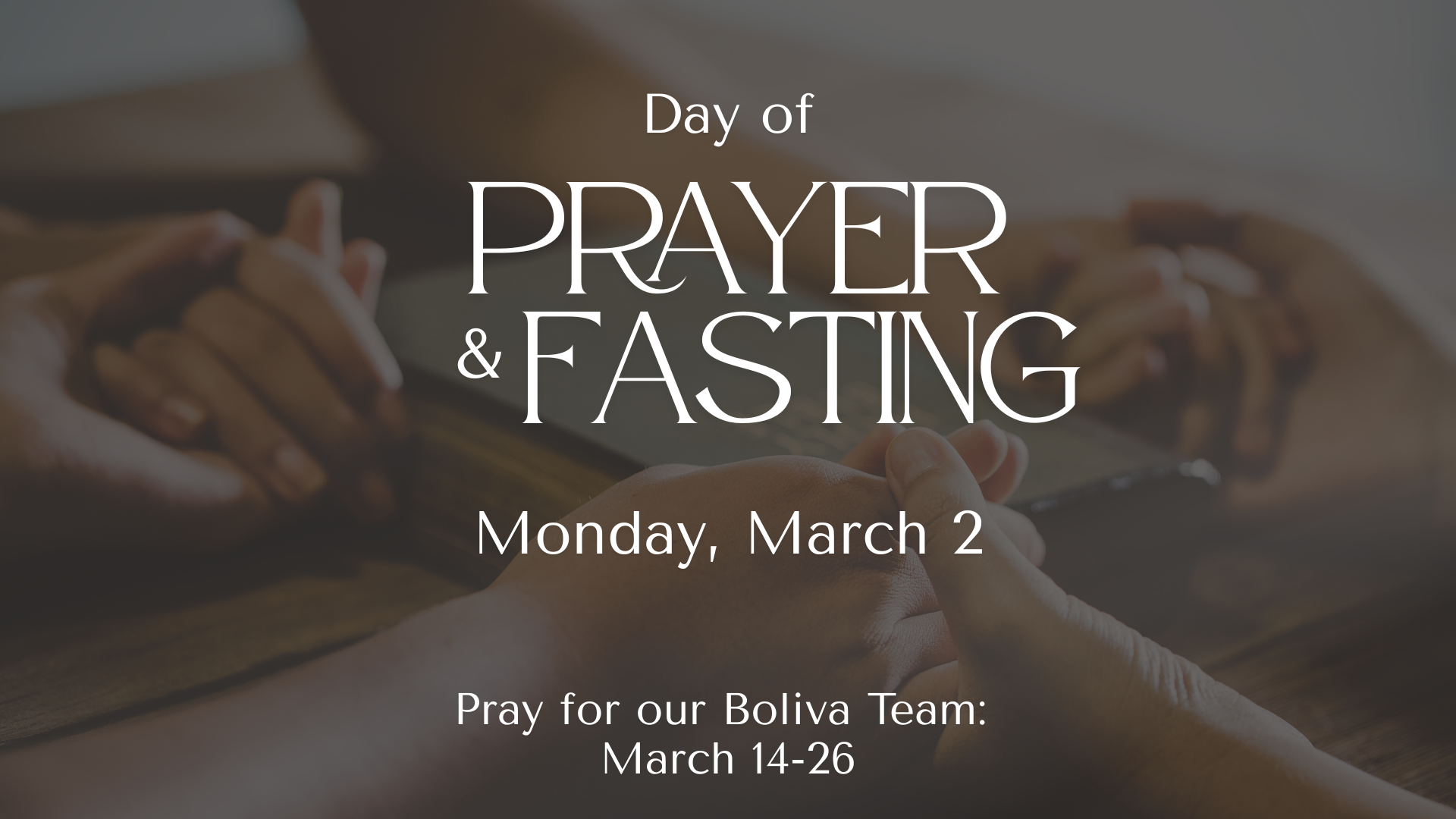 Join us for our Day of Prayer and Fasting on March 2nd. You can choose to participate in this day of prayer however you would like, wherever you find yourself. As an initiative to increase our dependency on the Spirit, and seeking God to do a transformative work in and through Sardis Fellowship, we set aside the first Monday of every month to fast and pray. We know not everyone is able to do this in the same way, or to the same degree, so we ask you to consider how you can make this work for you. Each month we highlight something to focus on, whether that be in the life of our church family, our local community or world. Sometimes we have specific things for you to pray through and sometimes we just give you the focus and allow God’s Spirit to guide you in your prayer time around that topic.